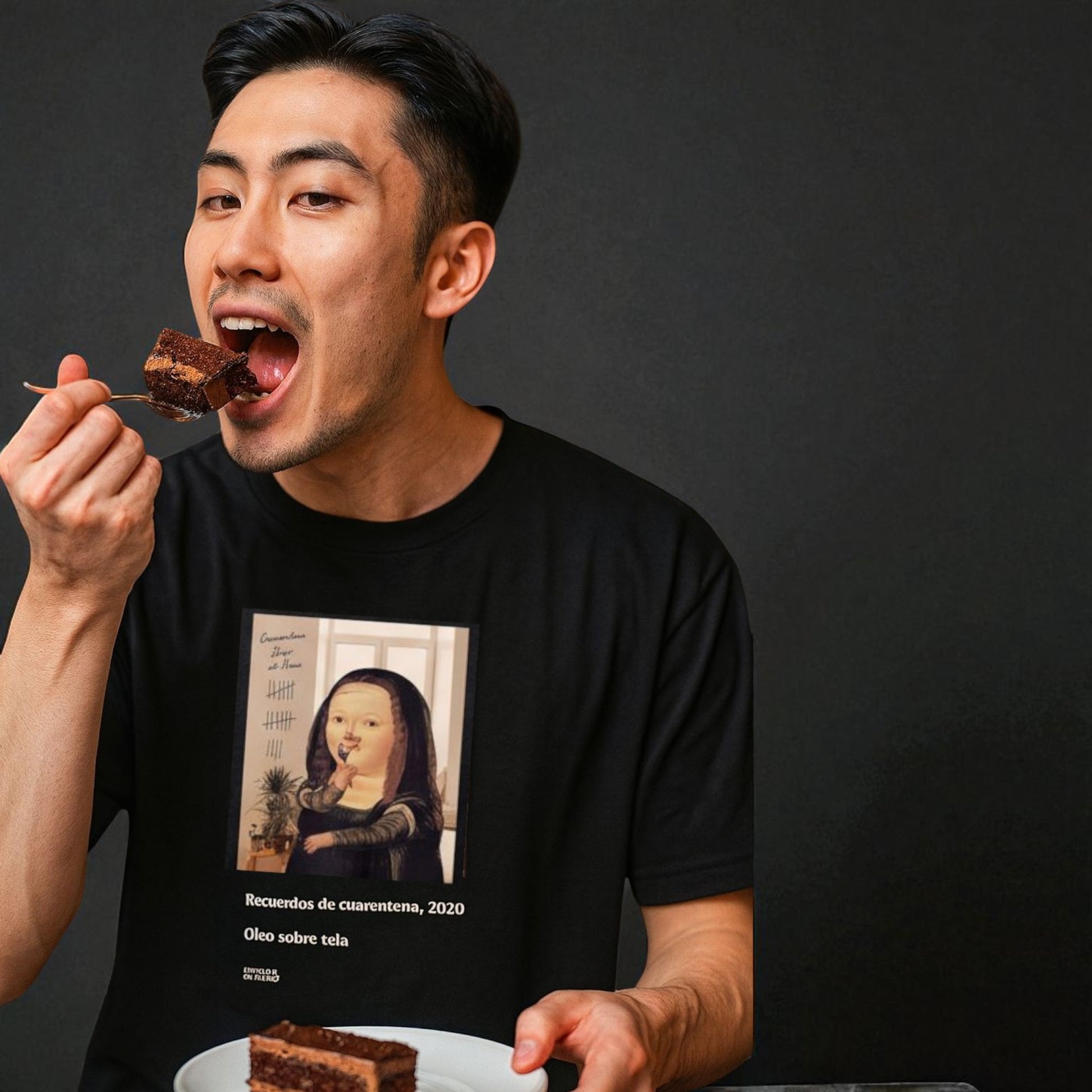 Presentamos la camiseta que resume con humor y arte esos largos meses en casa: La Mona Lisa Boteriana ha abandonado su enigmática sonrisa para entregarse al placer supremo: un pastel de chocolate. Y se nota. Inspirada en las redondeces voluptuosas y alegres del maestro Fernando Botero, esta versión es un homenaje a todos aquellos que sobrevivimos al encierro a base de harina, azúcar y antojos.